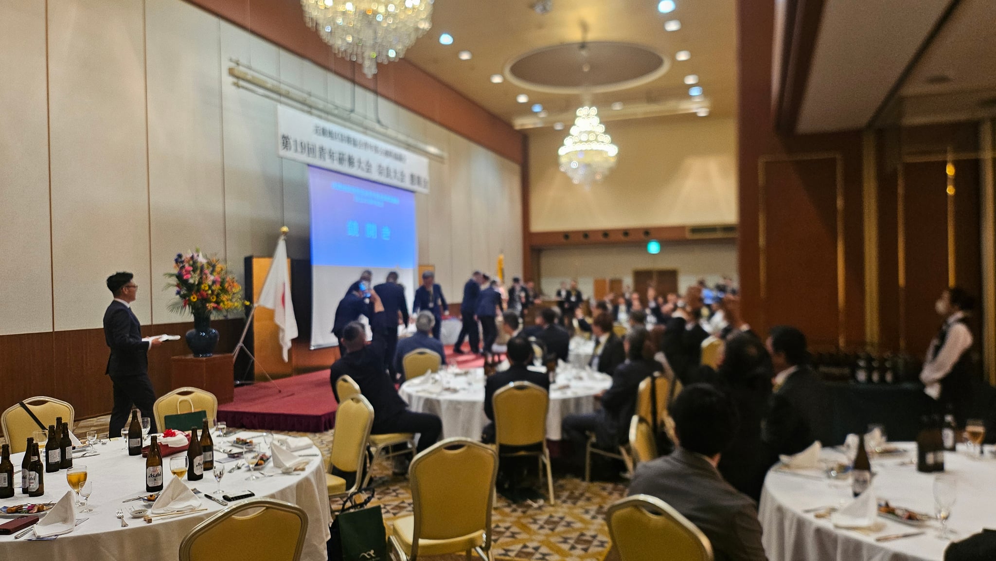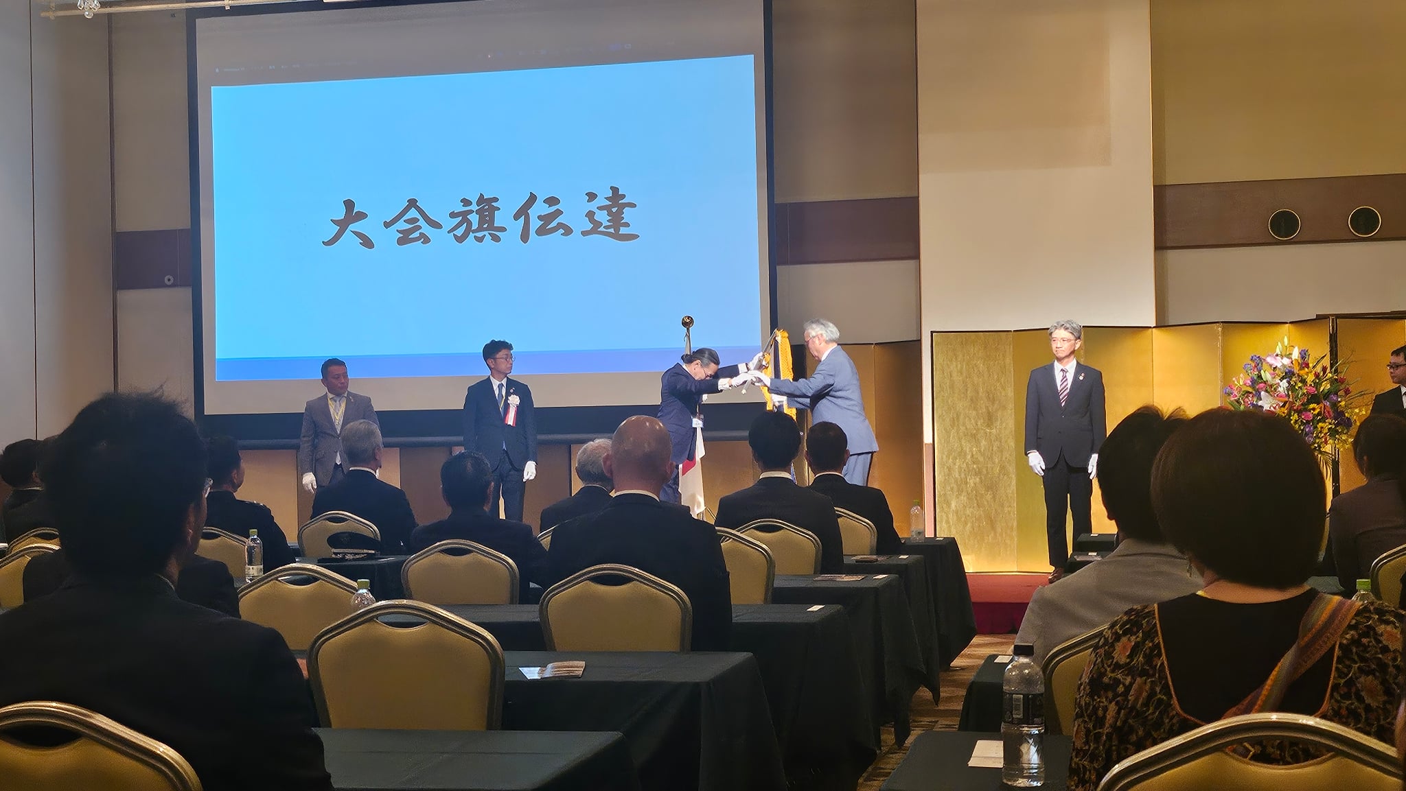 午後の部は奈良ロイヤルホテルにて、元統合幕僚長山崎幸二氏による記念講演を拝聴し、記念式典では次回開催地が発表され、近畿地区大会は京都府で開催されることになり、開催地の代表者に大会旗が伝達されました。