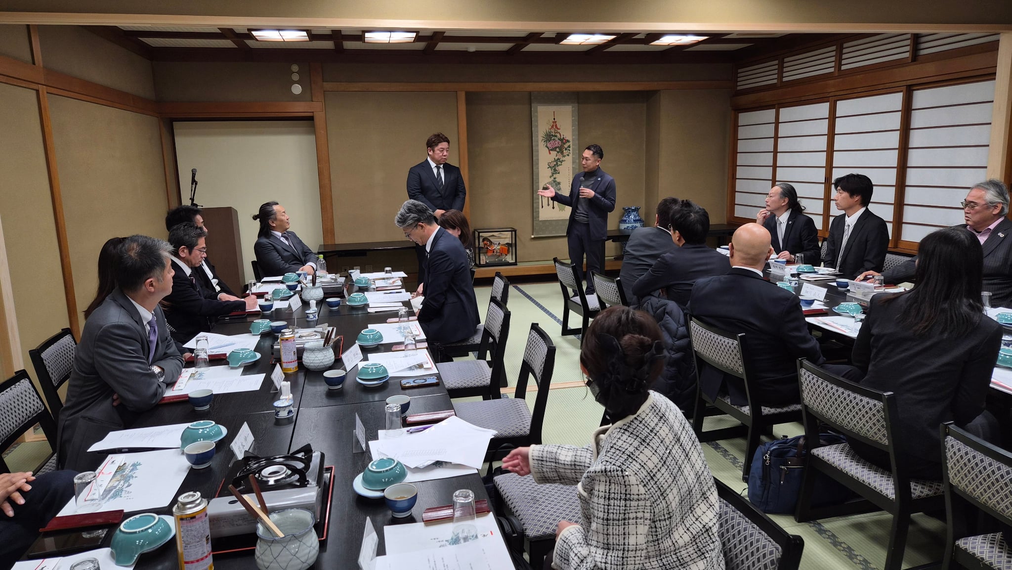 その後場所を移し役員会・臨時総会が開催され、近畿2府4県より各青年部会長並びに役員の方々が一堂に会し、滋賀県の久保近畿地区会長の挨拶に始まり、本会議では先日行われた青森研修旅行の報告と次年度部会長の選定と全国への出向について検討しました。